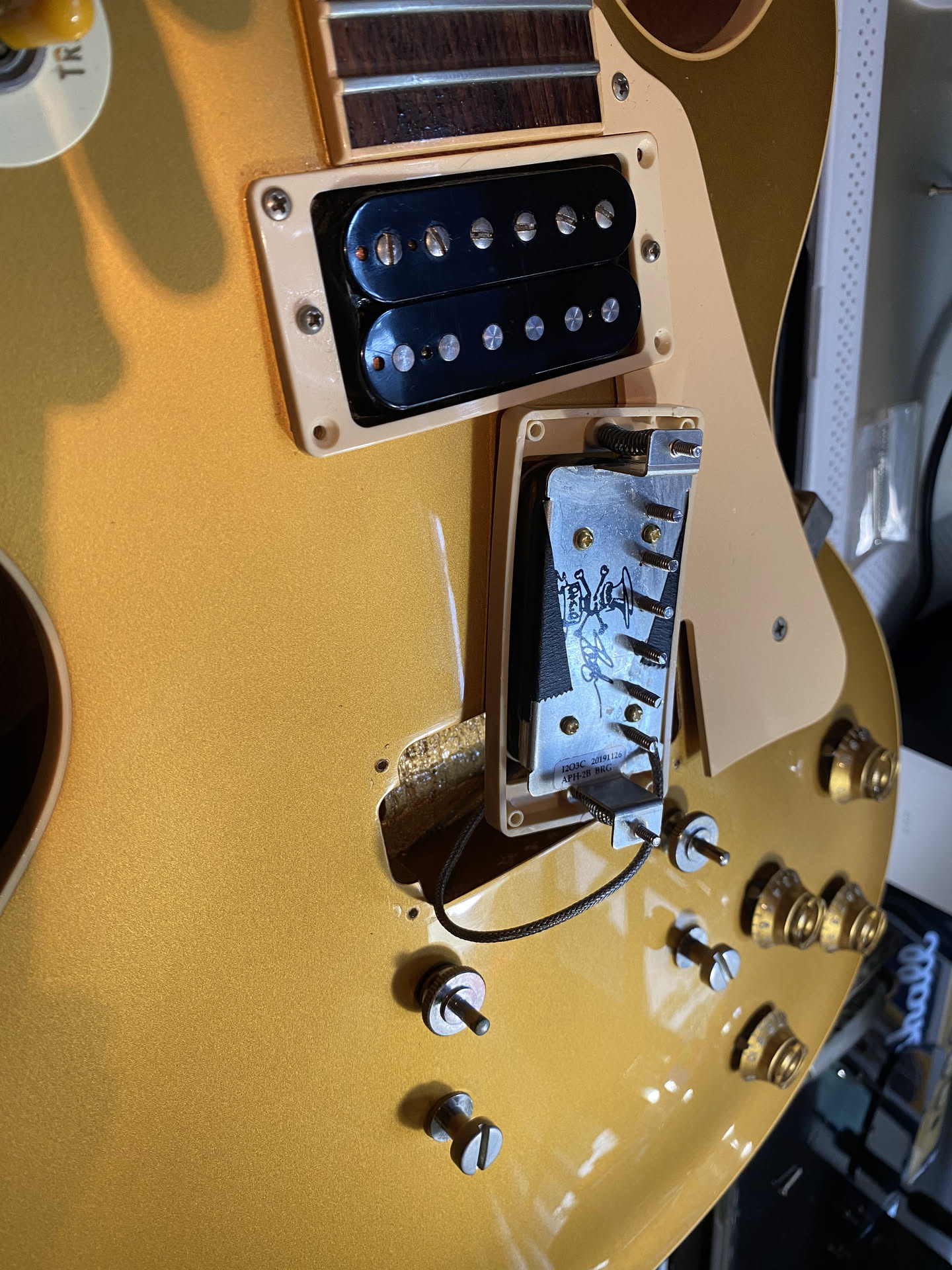 - Upgraded Hardware: (Faber TP-'59 Vintage Spec ALU Stop Tailpiece gold, ABRLB-GG Solid Bell Brass Locking Bridge gold, Faber Converter Studs, Gibson black pick guard, Gibson black toggle switch poker chip, Gibson black pickup surrounds, Gibson black jack plate, Gibson gold pickguard bracket)