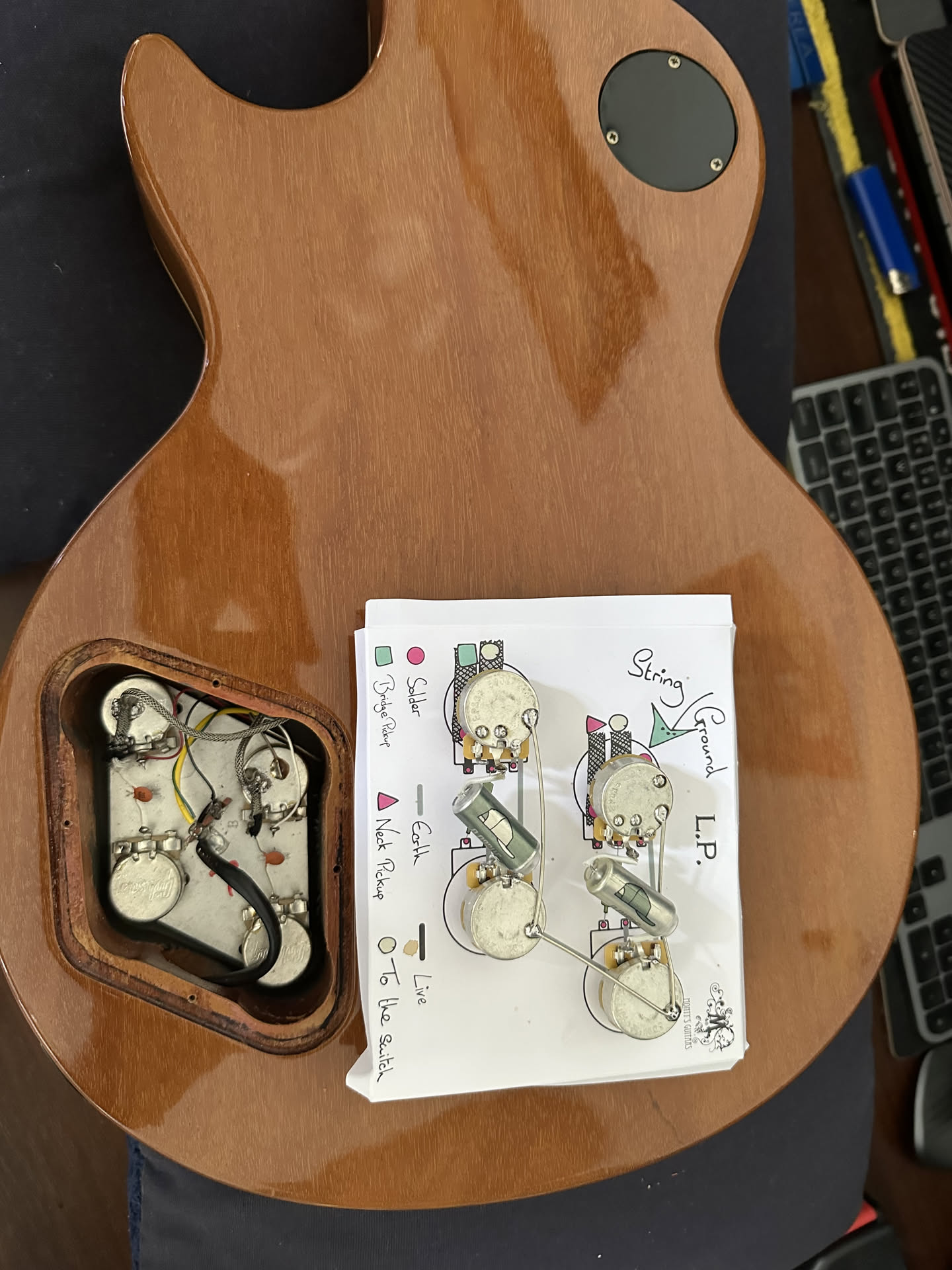 - Electronics rewired: (Monty's Guitars 50's wiring loom 0.015uf long shaft)